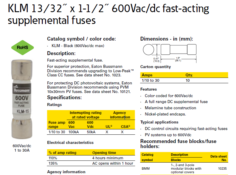 Bussmann熔斷器KLM 13?32? x 1-1?2? 600Vac/dc fast-acting