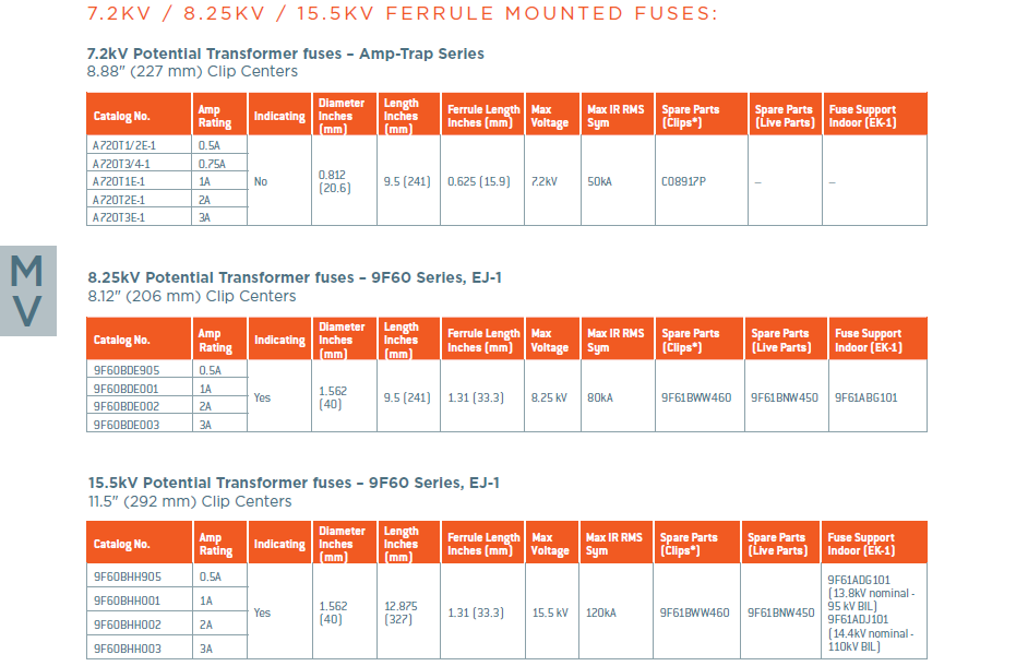 0.625KV – 2.4KV – 2.75KV – 4.8KV – 5.0KV – 5.5KV – 7.2KV – 8.25KV AND 15.5KV FERRULE MOUNTED FUSES